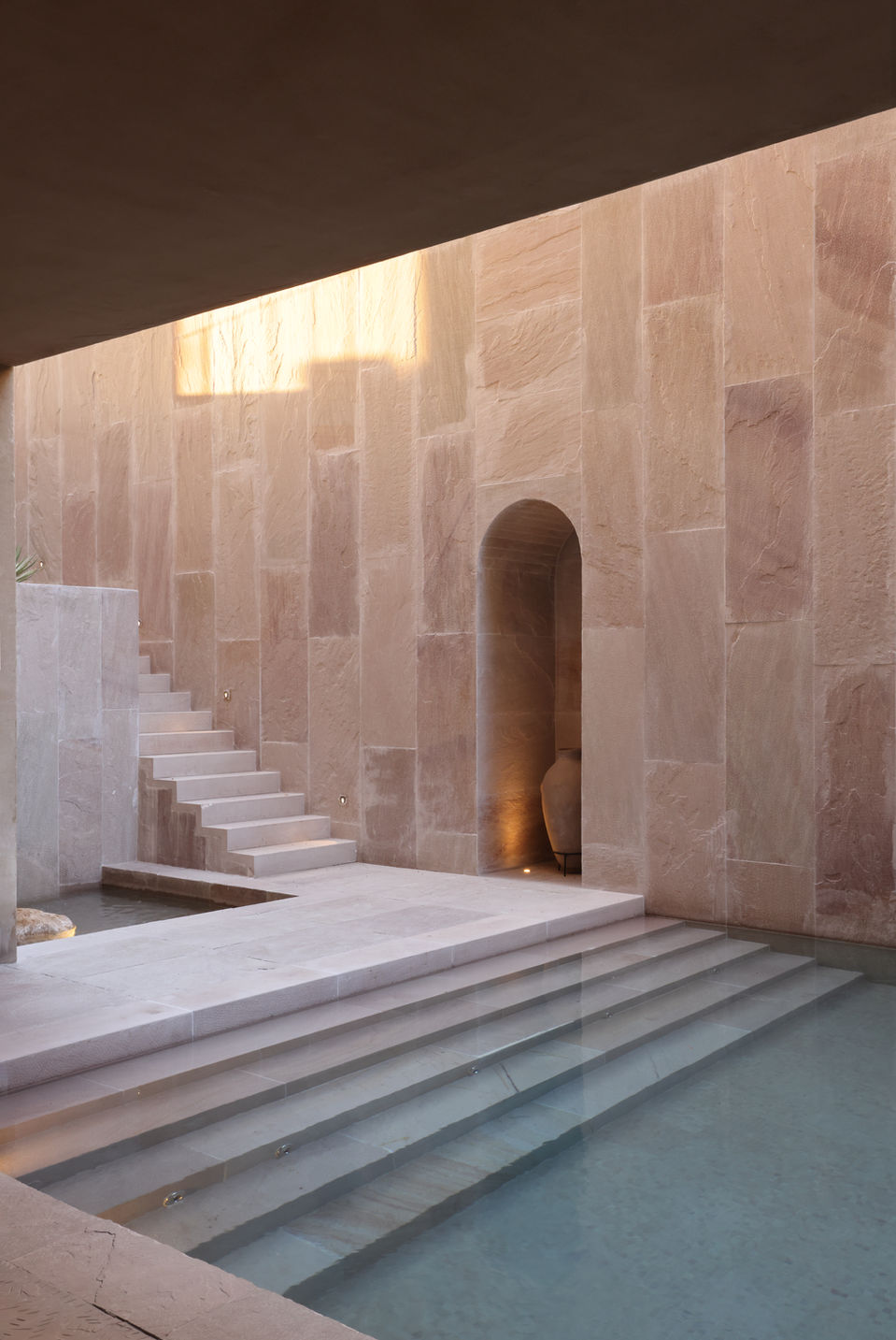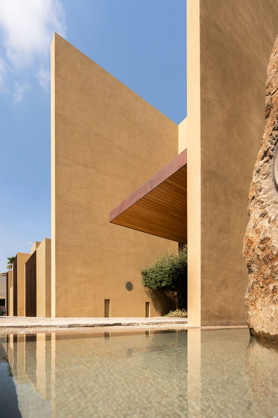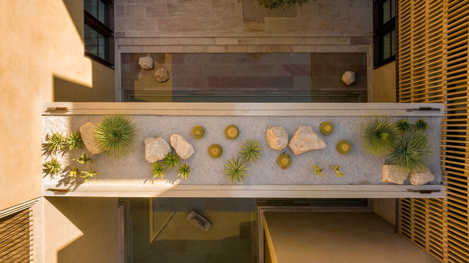 The house is introvert as well as extrovert, aiming & responding to the sites physical context. The exterior finish mimics the mud plastered walls of vernacular desert architecture. The house plan is dotted with a series of courtyards & water bodies (for passive cooling) which breathe life to the adjacent spaces thus blurring the boundaries of insides & outsides.